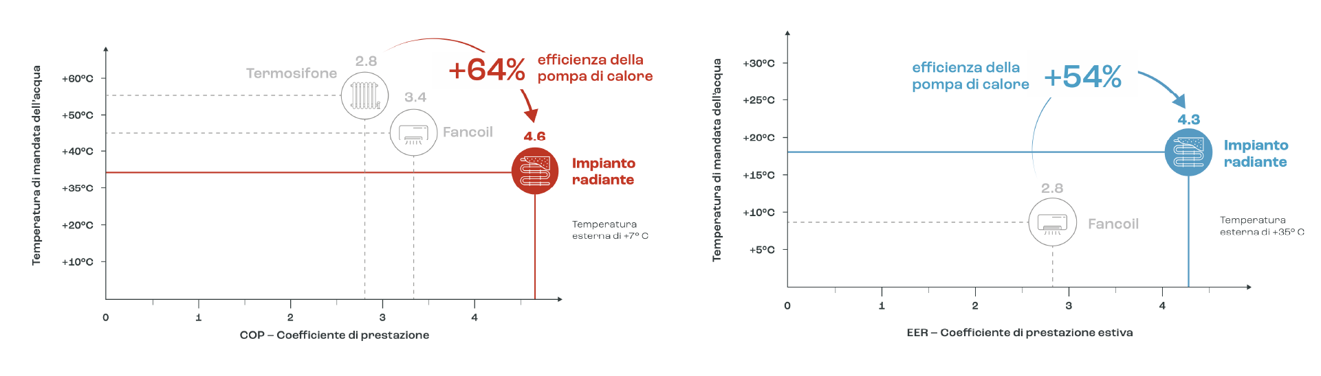La bassa temperatura operativa dei sistemi radianti consente alle pompe di calore di funzionare con maggiore efficienza.