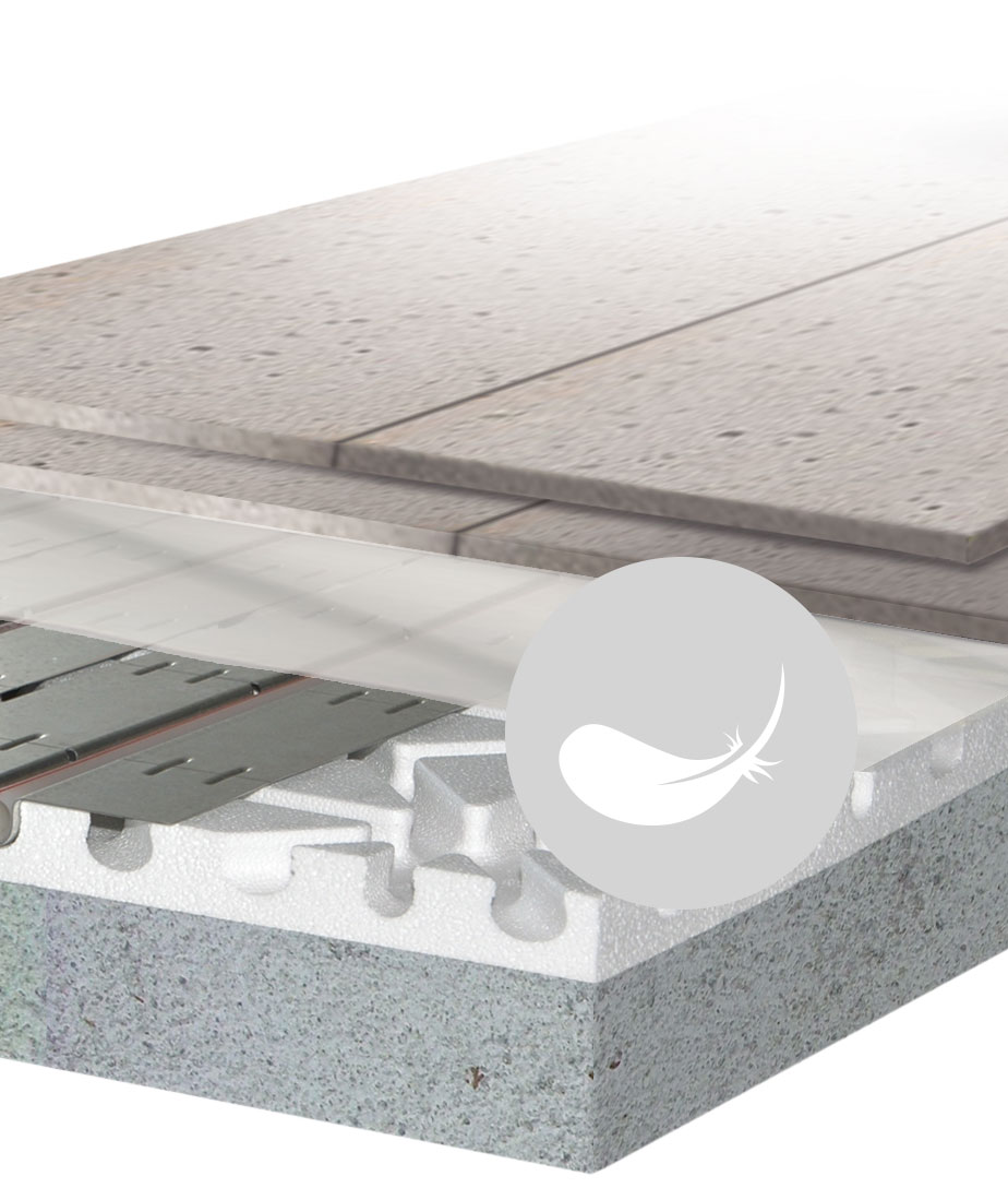 Lightweight and versatile, with its low weight on the floor (18 mm fibre plaster, weight 32 kg/m2), the Euroslim underfloor radiant system is ideal for renovations and loft applications requiring limited loads.